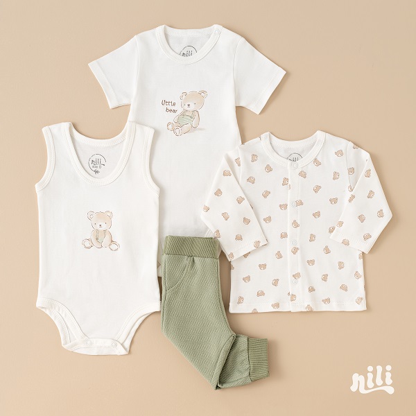 سرهمی، بادی آستین کوتاه، بادی رکابی، مانتو، شلوار، کلاه، دستکش، جوراب، پیشبند، پتو دورپیچ کلاهدار، آروغگیر و سایر تکههای ضروری که نوزاد در ماههای اول نیاز دارد.