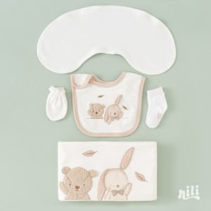 ست 13 تیکه نیلی مدل برگ ریزان شامل مجموعهای از لباسهای ضروری مانند : سرهمی، بادی آستین کوتاه، بادی رکابی، مانتو، شلوار، کلاه، دستکش، جوراب، پیشبند، پتو دورپیچ کلاه دار، آروغ گیر می باشد. این ست با طراحی هماهنگ و رنگهای زنده، تجربهای دلنشین و راحت برای نوزاد و والدین فراهم میکند.