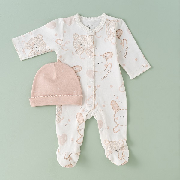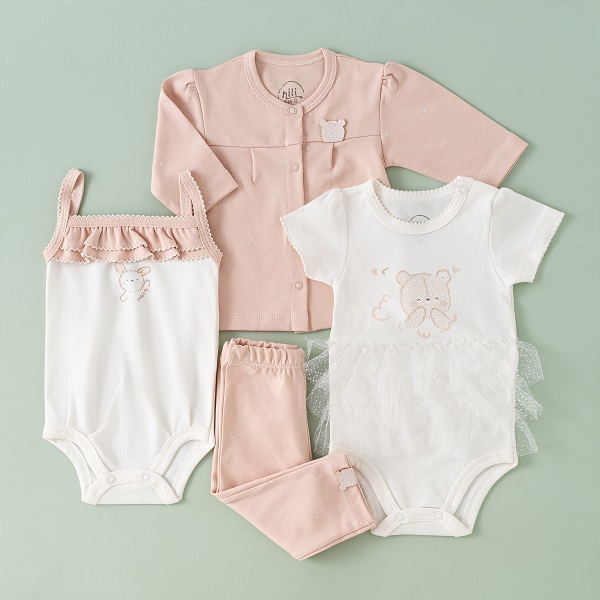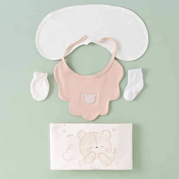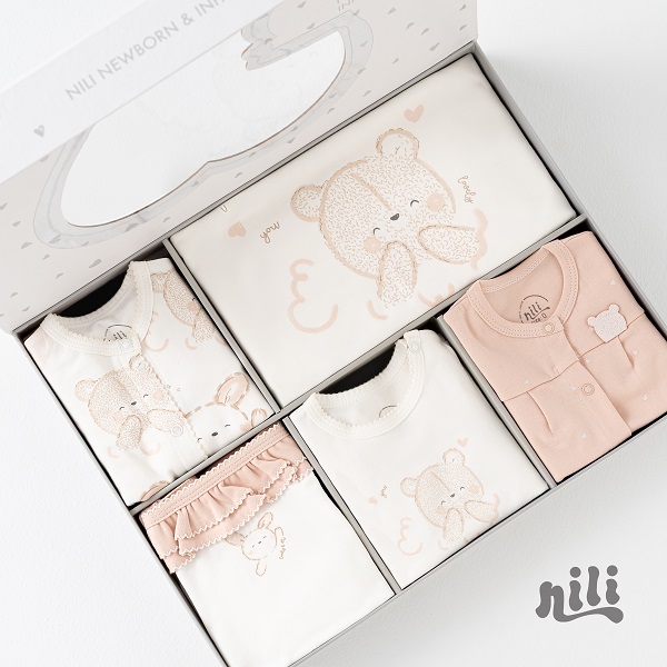 ست 13 تیکه نیلی مدل خرس صورتی شامل مجموعهای از لباسهای ضروری مانند : سرهمی، بادی آستین کوتاه، بادی رکابی، مانتو، شلوار، کلاه، دستکش، جوراب، پیشبند، پتو دورپیچ کلاه دار، آروغ گیر می باشد. این ست با طراحی هماهنگ و رنگهای زنده، تجربهای دلنشین و راحت برای نوزاد و والدین فراهم میکند.