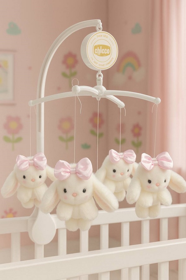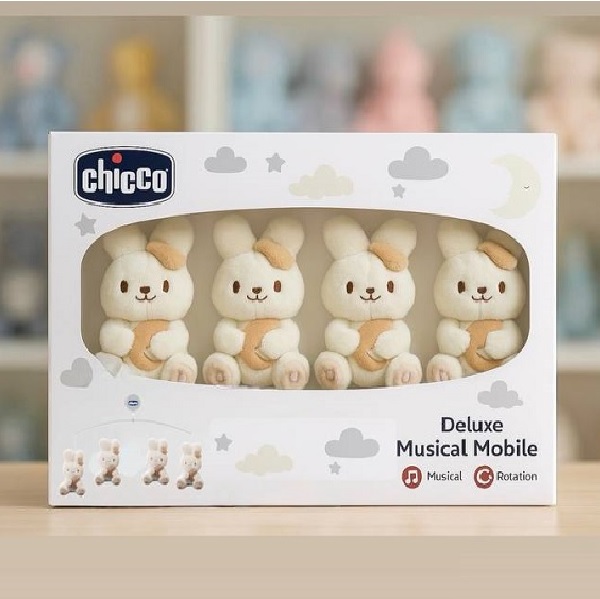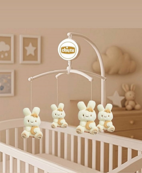 آویز تخت موزیکال چیکو طرح خرگوش بزرگ با جنس پولیشی ضد حساسیت، موسیقی آرامش‌بخش و طراحی کودک‌پسند، گزینه‌ای عالی برای خواب راحت نوزاد و زیبایی تخت کودک است.