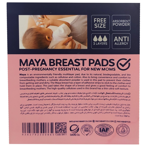 پد سینه مایا از ۱۰۰٪ پنبه طبیعی تولید شده و دارای لایه بیرونی ضد نشت است که لباس را کاملاً خشک نگه می‌دارد. این محصول بسیار نرم و لطیف بوده و برای پوست حساس مادران کاملاً ایمن است. طراحی نازک و سبک آن باعث می‌شود زیر لباس دیده نشود و مادر در طول روز یا حتی هنگام خواب احساس راحتی کامل داشته باشد.